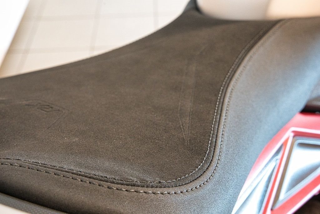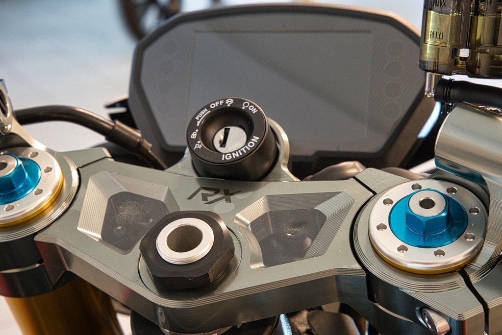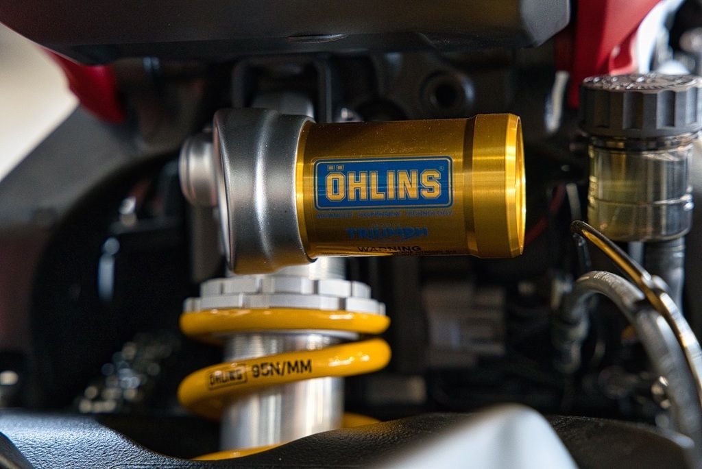 Ausgestattet mit einstellbarer Öhlins NIX Upside-Down-Gabel und STX40 Federbein, Stummellenker und rennstreckentauglichen Komponenten für präzises Handling.